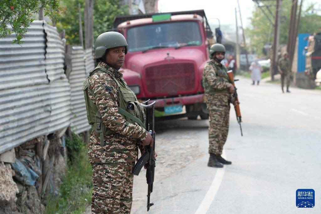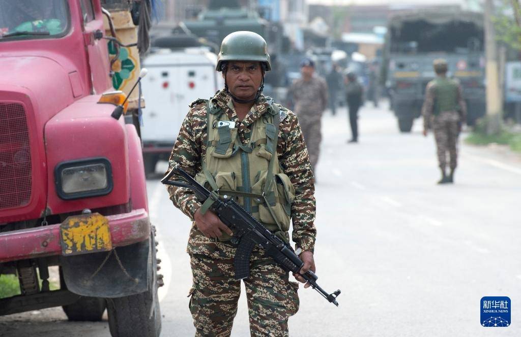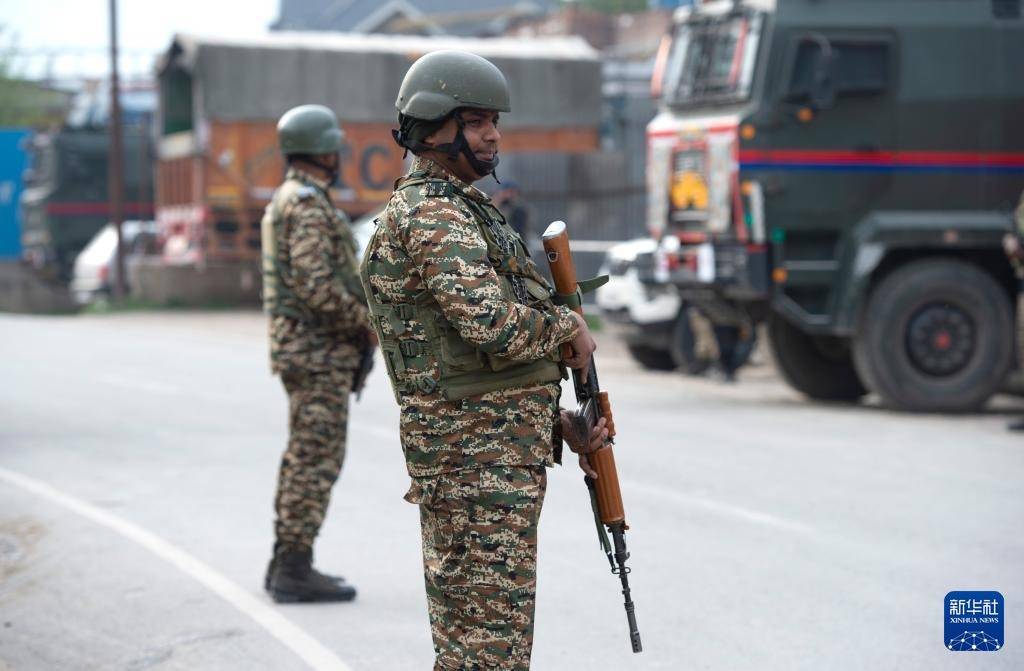 5月7日,在印控克什米尔首府斯利那加市郊,印度准军事部队成员在一个检查站警戒。