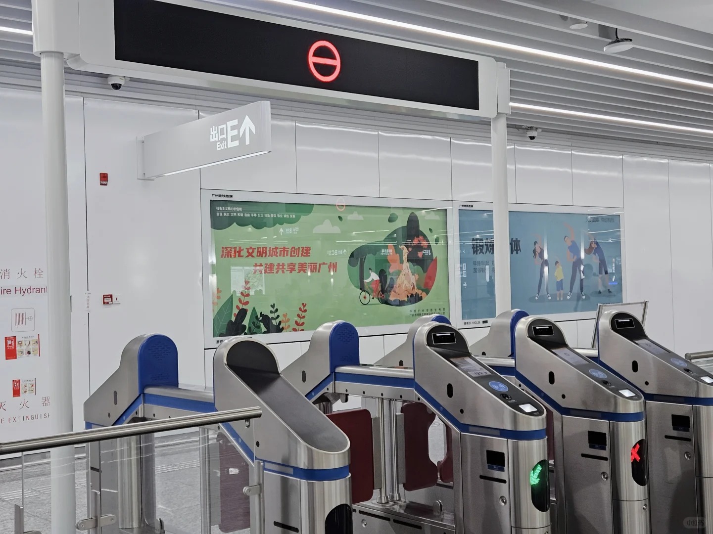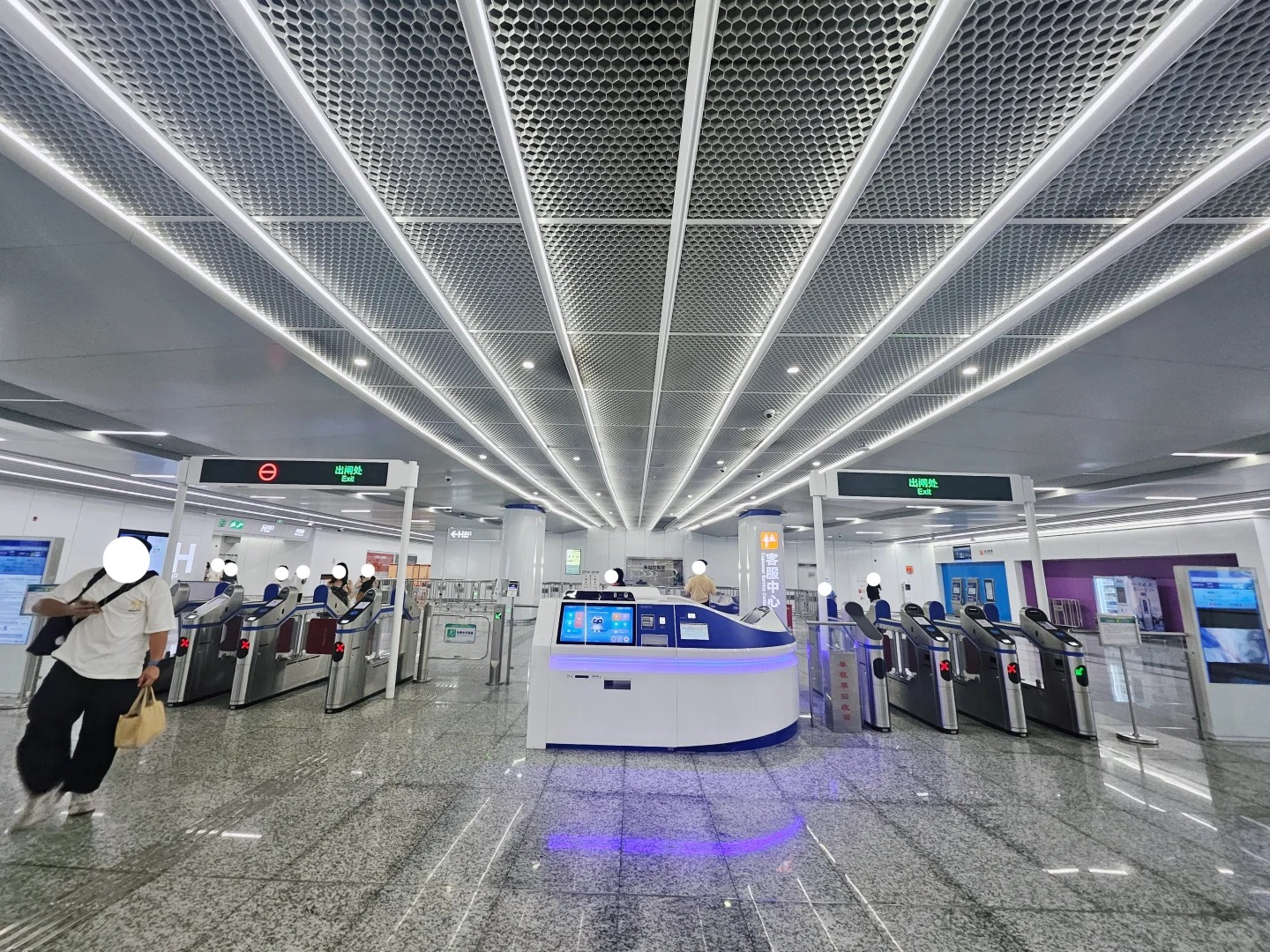 或许是出于美观或是对新闸机通过性的自信 不同于其他客流大站的一排闸机 磨碟沙站含蓄的将闸机以3台一组的排列 一个出入口仅设一到两组面对,过少的闸机数量也是本站在迎来大客流时难以应对的一大原因。18号线磨碟沙站出入口均为两扶梯+一楼梯配置 平峰期面对出口前的6台闸机已经稍显局促 高峰期往往早已大排长龙,况且新闸机的通过性相比老款并无明显提升。