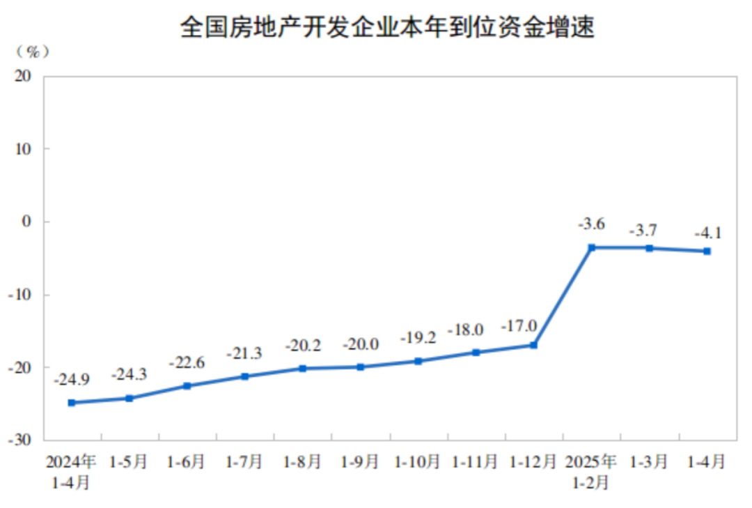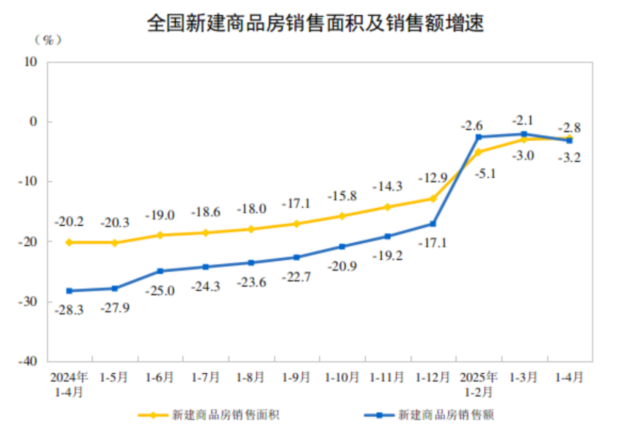 付凌晖指出,随着房地产销售回暖,房地产企业商品房库存减少,开工建设出现改善。1-4月份,全国房屋新开工面积同比降幅比1-3月份收窄0.6个百分点。